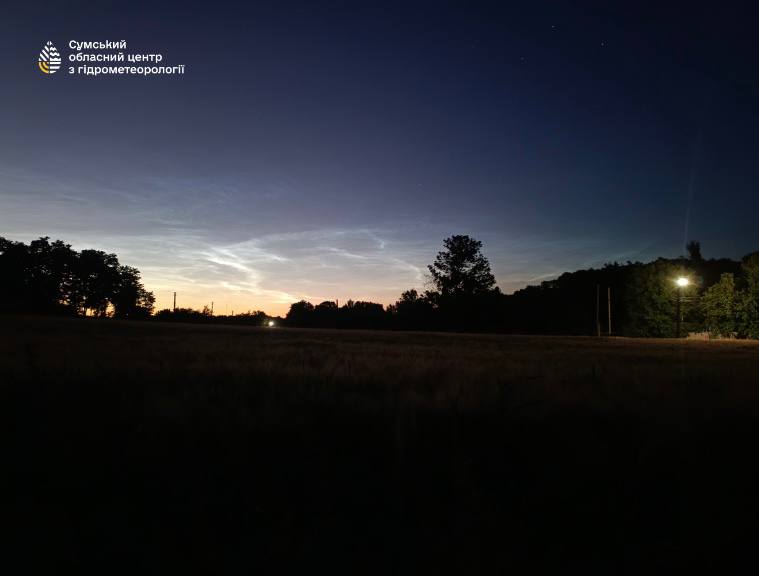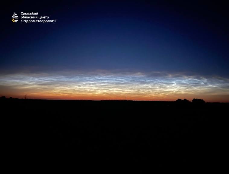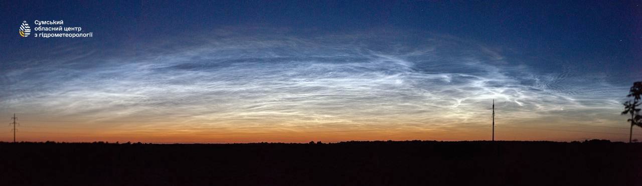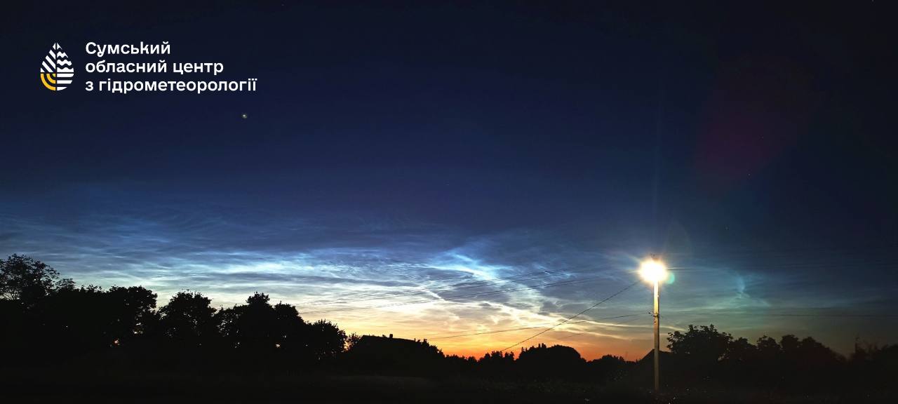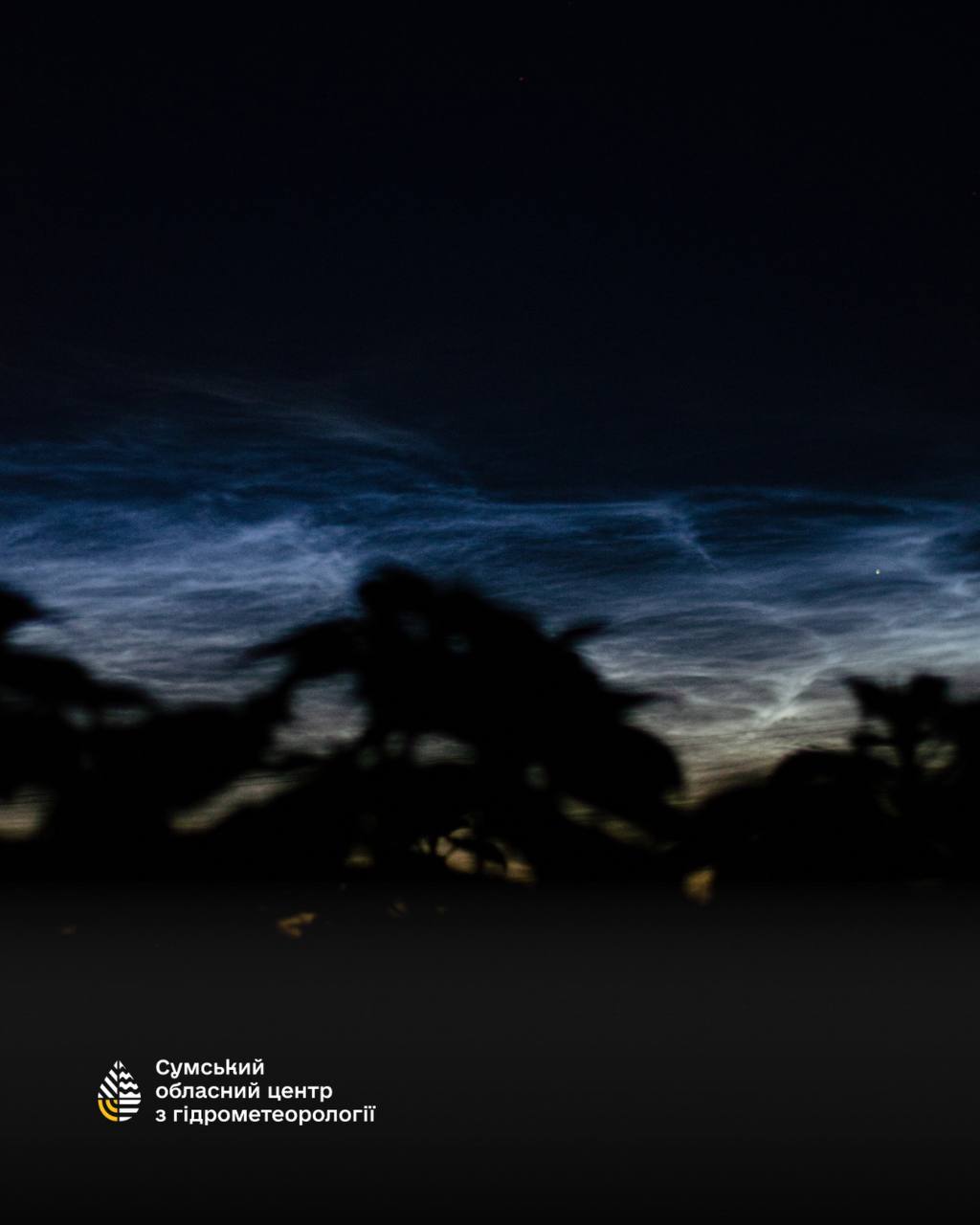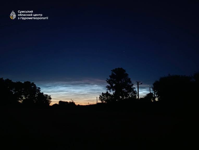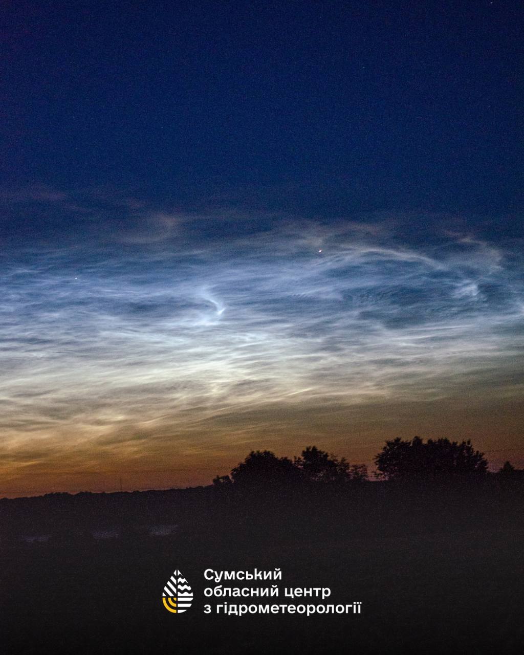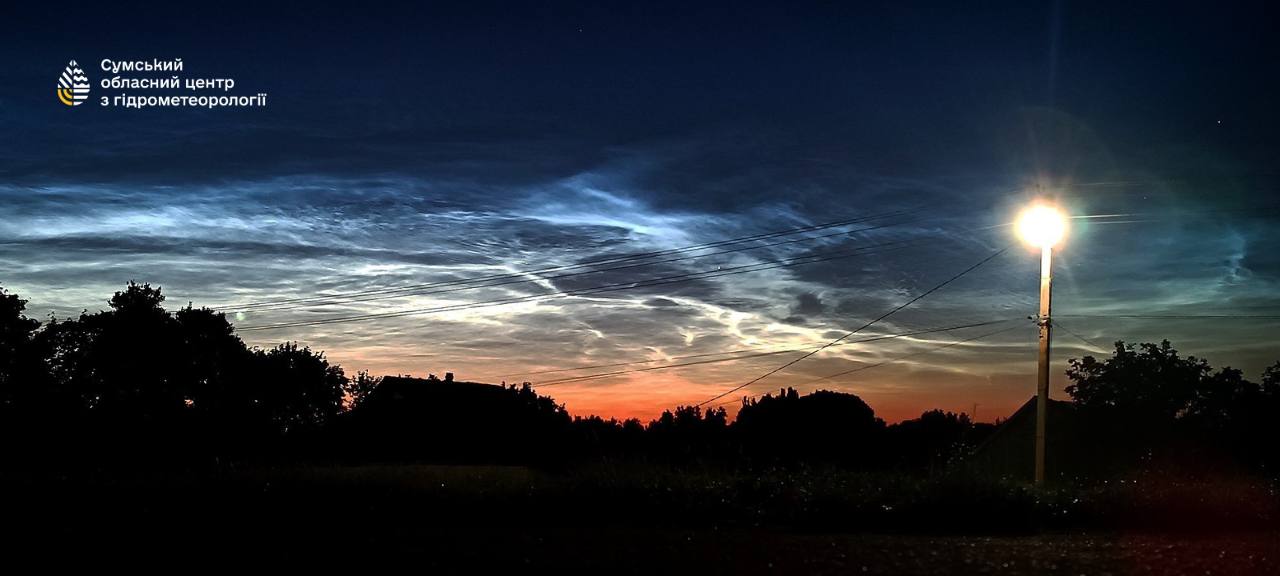 Учора ввечері над Сумською областю небо прикрасили сріблясті хмари — це рідкісне атмосферне явище, яке можна побачити лише влітку, у сутінках. Це найвищі хмари в атмосфері Землі, які сяють завдяки відбитому сонячному світлу на висоті близько 80 км!