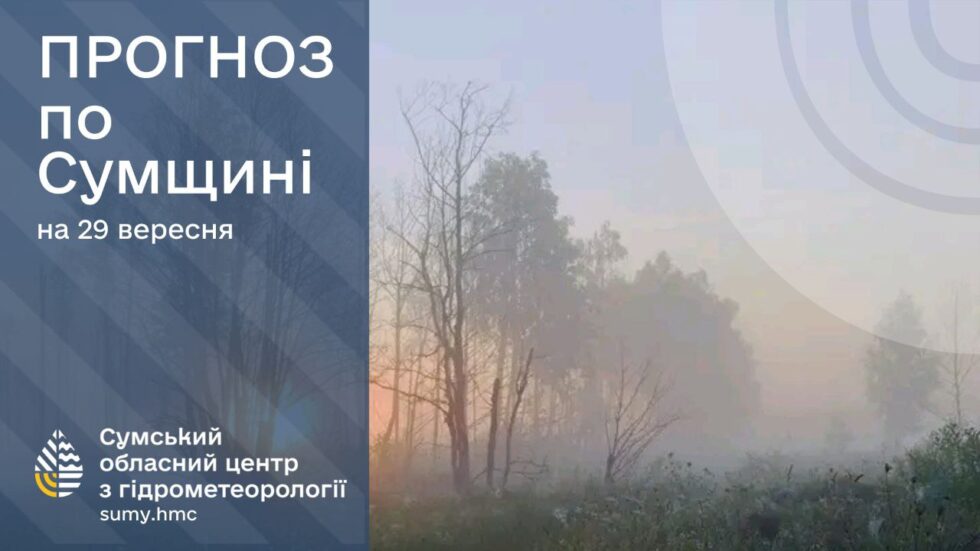 29 вересня: хмарно з проясненнями, невеликий дощ, вночі та вранці місцями туман. Вітер південно-східний, вночі 5-10 м/с, вдень 9-14 м/с. Температура повітря по області вночі +4°..+9°, вдень, +10°..+15°, по м.Суми вночі +7°..+9°, вдень, +13°..+15°.
