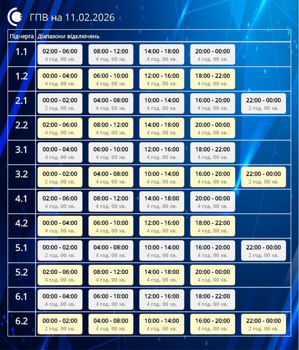 У середу, 11 лютого, на Сумщині діятимуть графіки погодинних відключень відповідно до команди НЕК “Укренерго”.